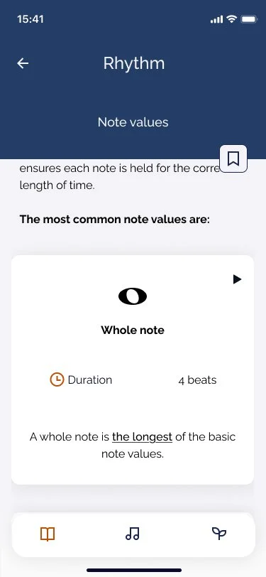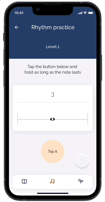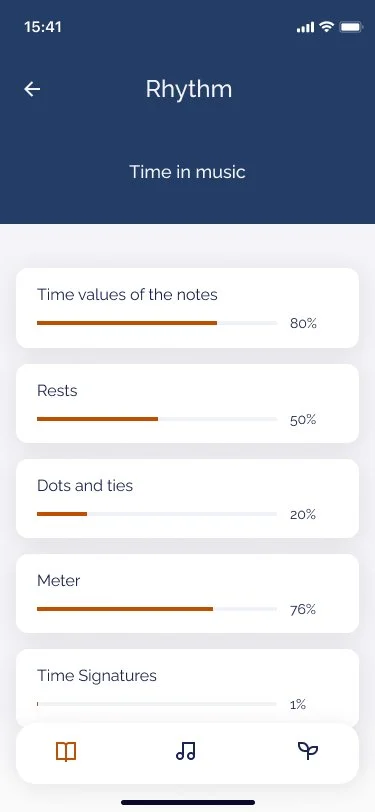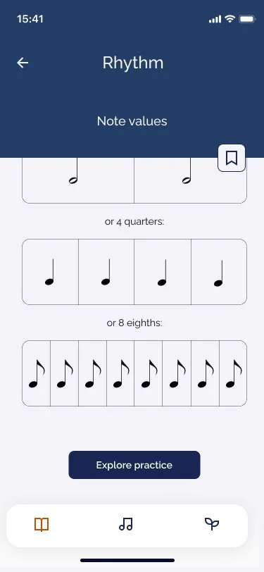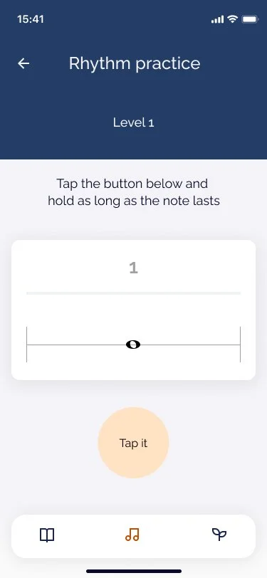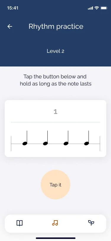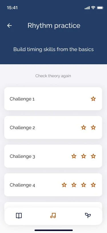 The Practice block reflects the theory topic learned, in this case Rhythm practice, allowing users to directly apply their knowledge in a focused exercise.