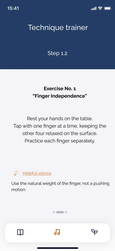 The Finger Gym module addresses this challenge by guiding users through focused exercises that build strength, coordination, and healthy playing habits.