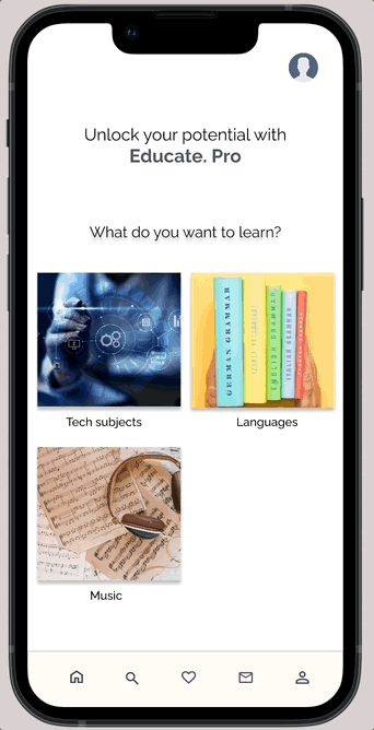 Educate.Pro is a design concept for a tutoring services app that enables users to book private lessons with verified tutors and includes a payment system allowing for advance cancellations with refunds.